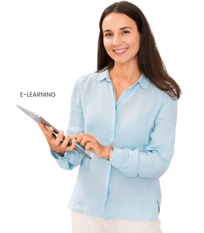 E-learning uses videos, quizzes, and visuals to make lessons engaging and improve learner performance.