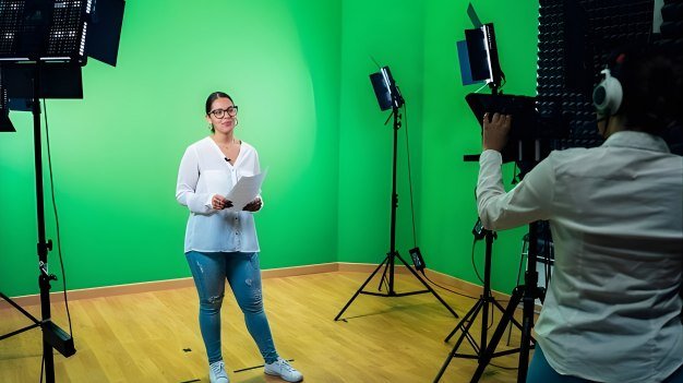 Green background setup for speakers, enhanced with animation and video effects, ideal for YouTube creators.
